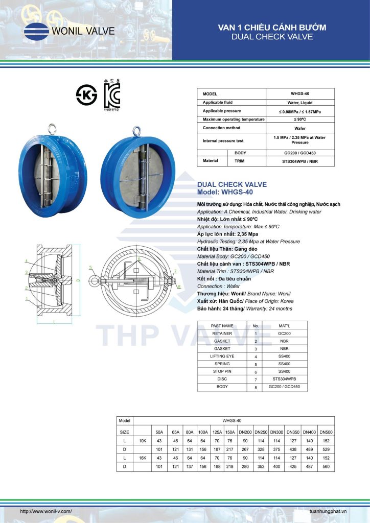 1. Thông Số Kỹ Thuật Van Một Chiều Lá Lật Wonil – Hàn Quốc.